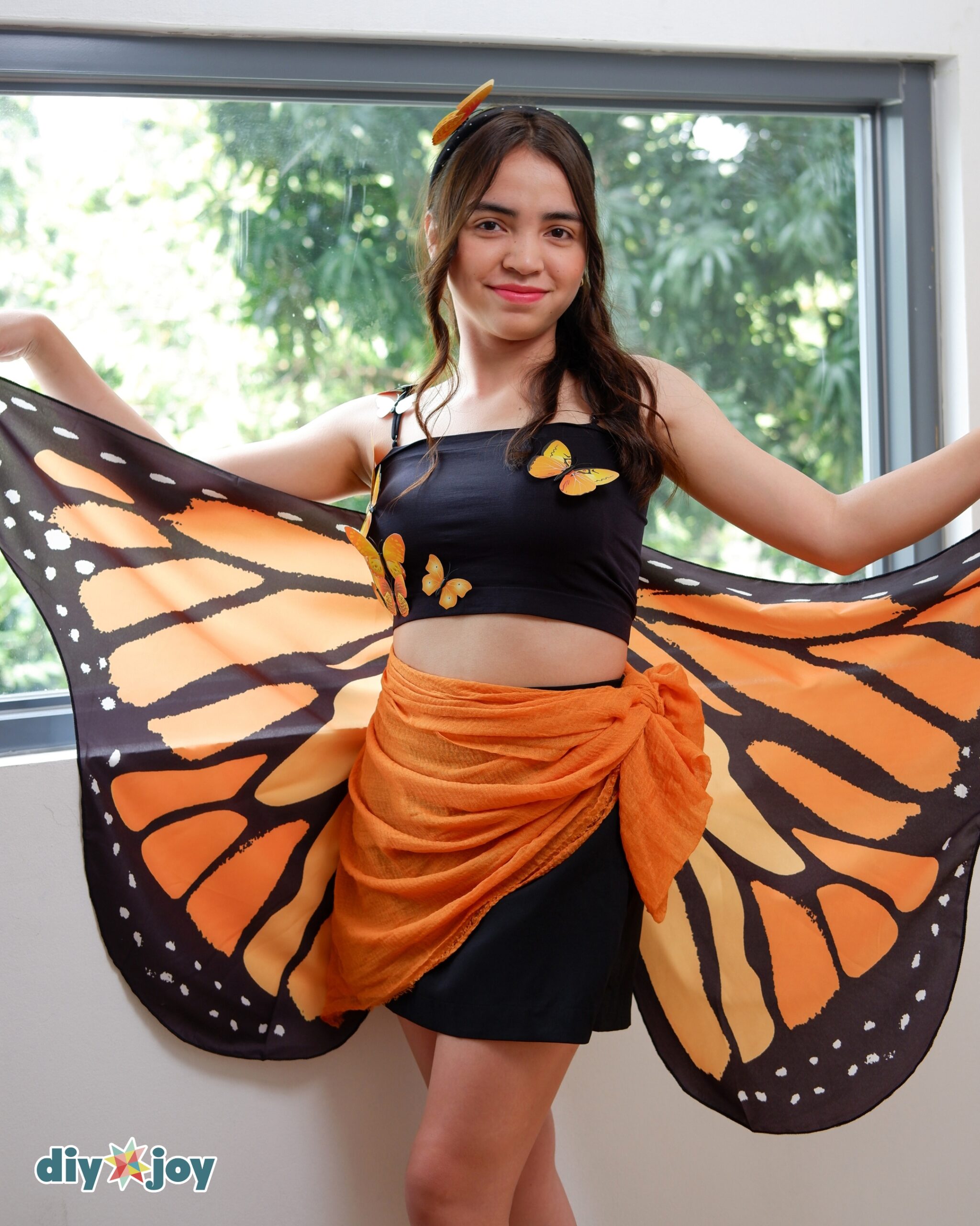 To complete the look, wear a black skirt, attach the fabric wings to the back of your top, tie an orange scarf around your waist, and wear black heels.
