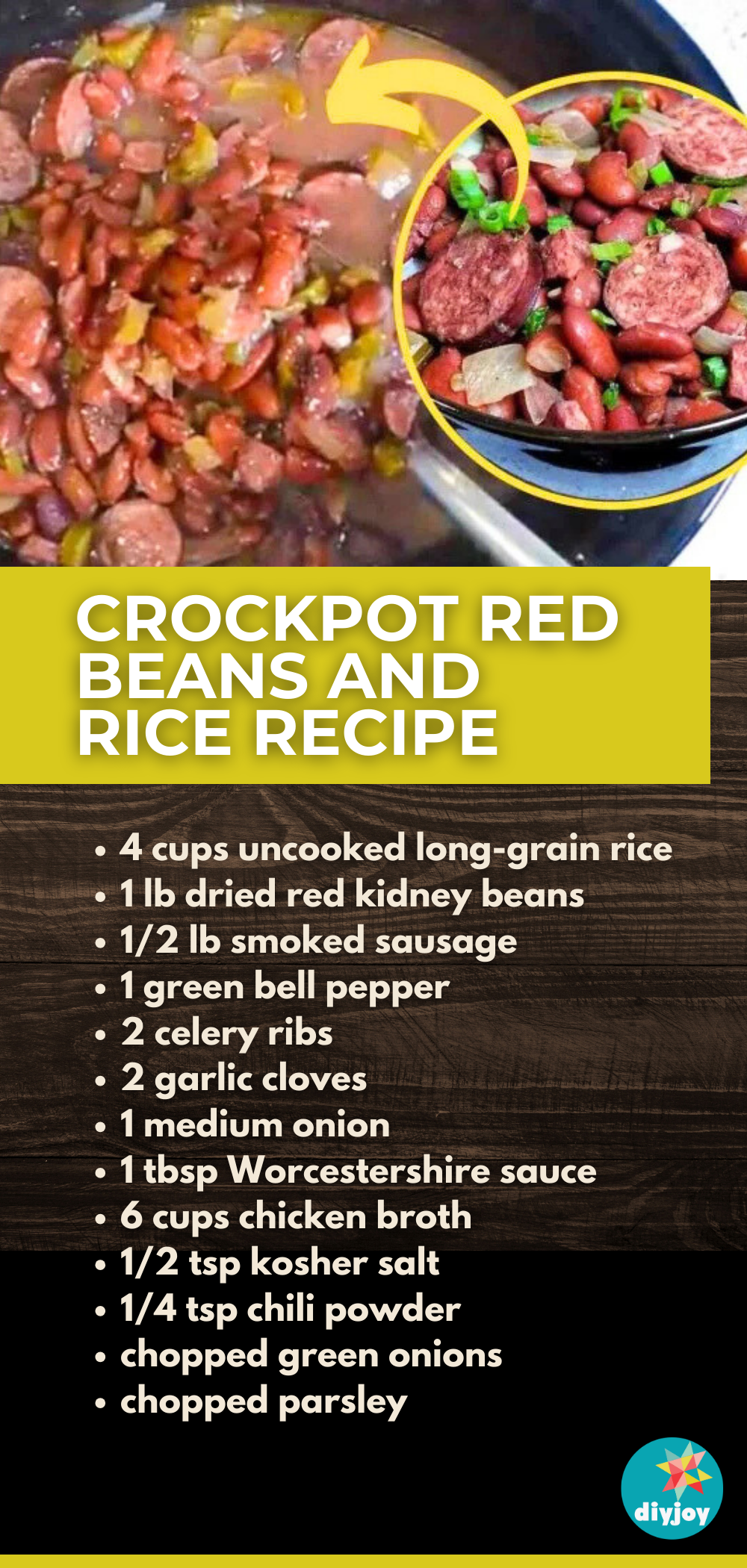 To start, add the red kidney beans to the crockpot followed by 2 finely chopped celery ribs, 1 finely diced medium onion, and the sliced sausage. Next, pour 6 cups of chicken broth and 1 tbsp Worcestershire sauce. Finally, season with 1/2 tsp kosher salt and 1/4 tsp chili powder, then mix everything together to combine.