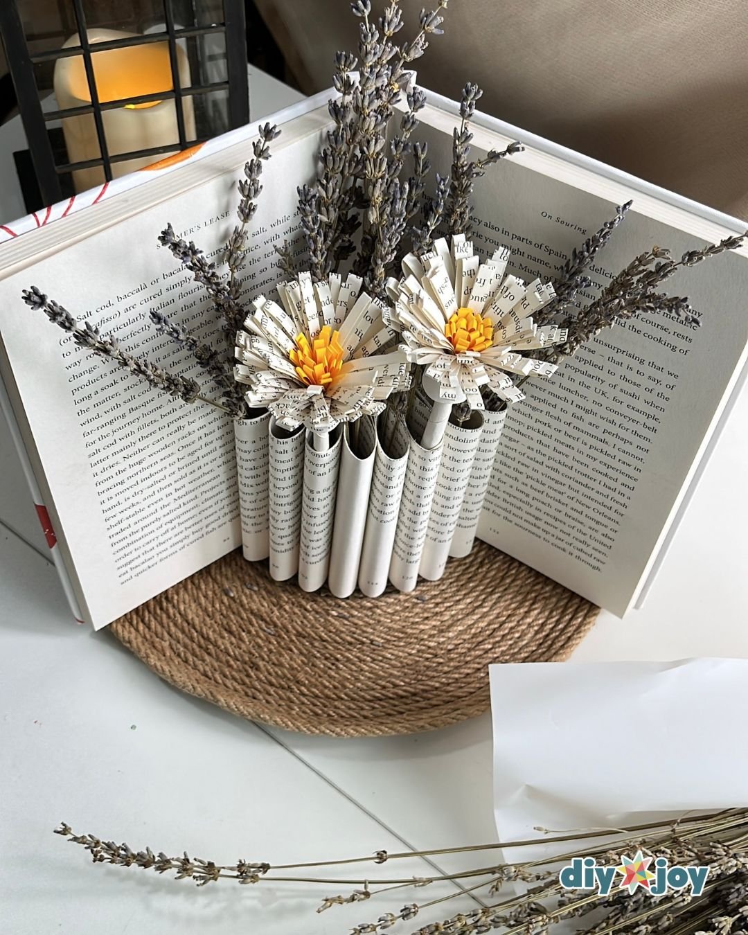 I styled the book using dried lavender flowers and paper flowers made from the cut-out pages. I’ll share a tutorial for that project soon in case you’d like to make it too.