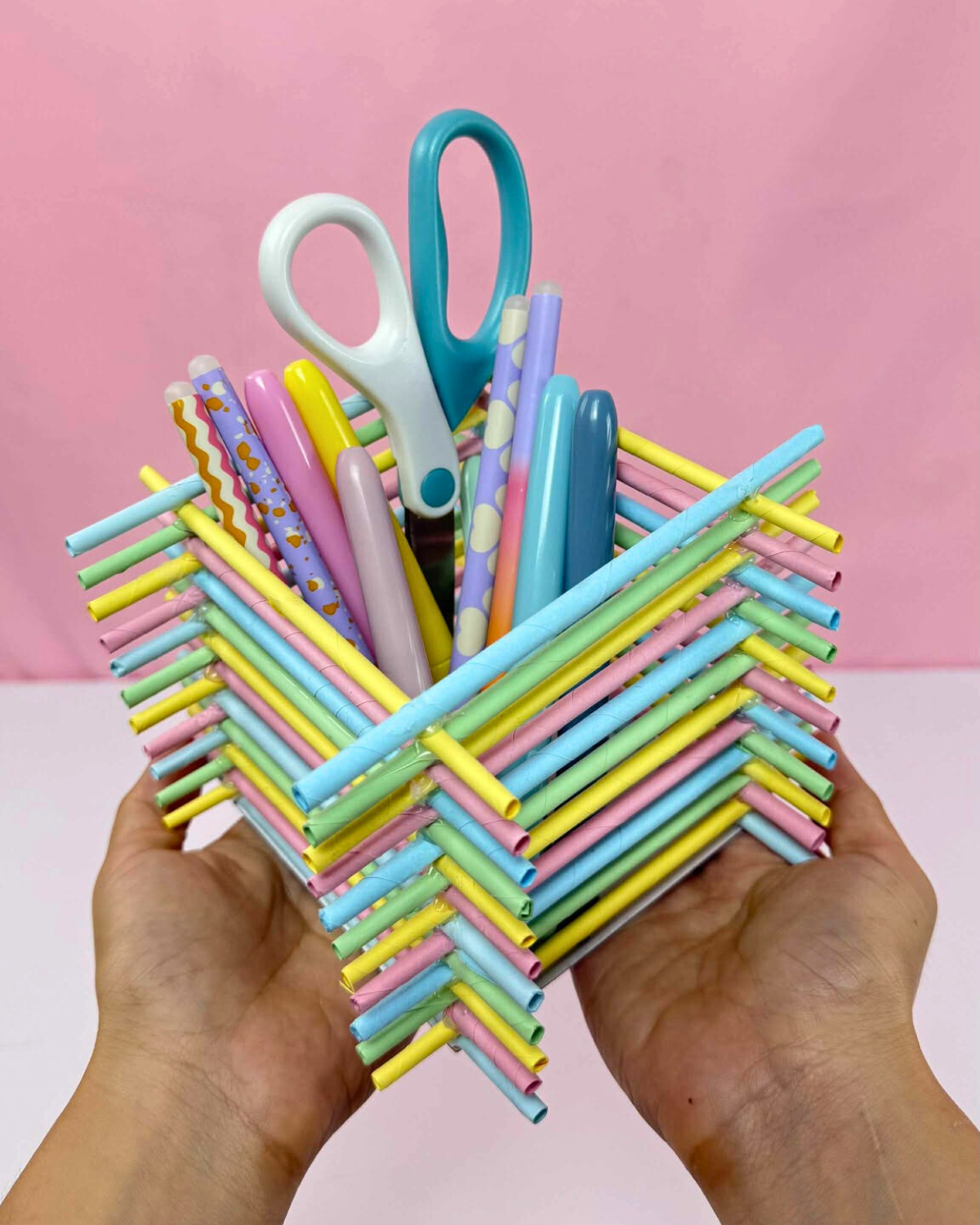 Once the pen holder is assembled, trim any excess paper tube edges with sharp scissors to achieve your desired length. Place your pens, pencils, and scissors inside—and your DIY colored paper pen holder is ready to use!