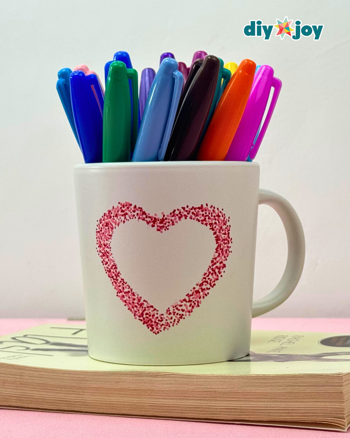 Place the paper heart in the center of the mug. Start adding dots around the heart using a red Sharpie, and switch to a pink Sharpie if you want more variation in color. You can allow some dots to slightly overlap onto the paper for a more defined outline of the heart shape.Step 3: Remove the Paper Heart