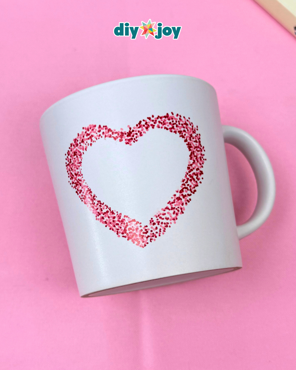 Once you’re satisfied with the number of dots, carefully peel off the paper heart from the mug—your mug is finished!