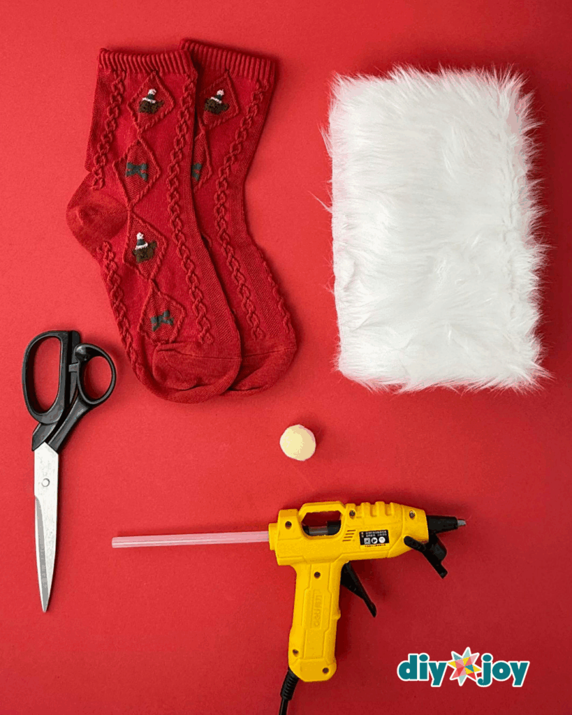 Cut the sock as shown, keeping the long section for the Santa hat.Step 2: Secure the Sock Sections