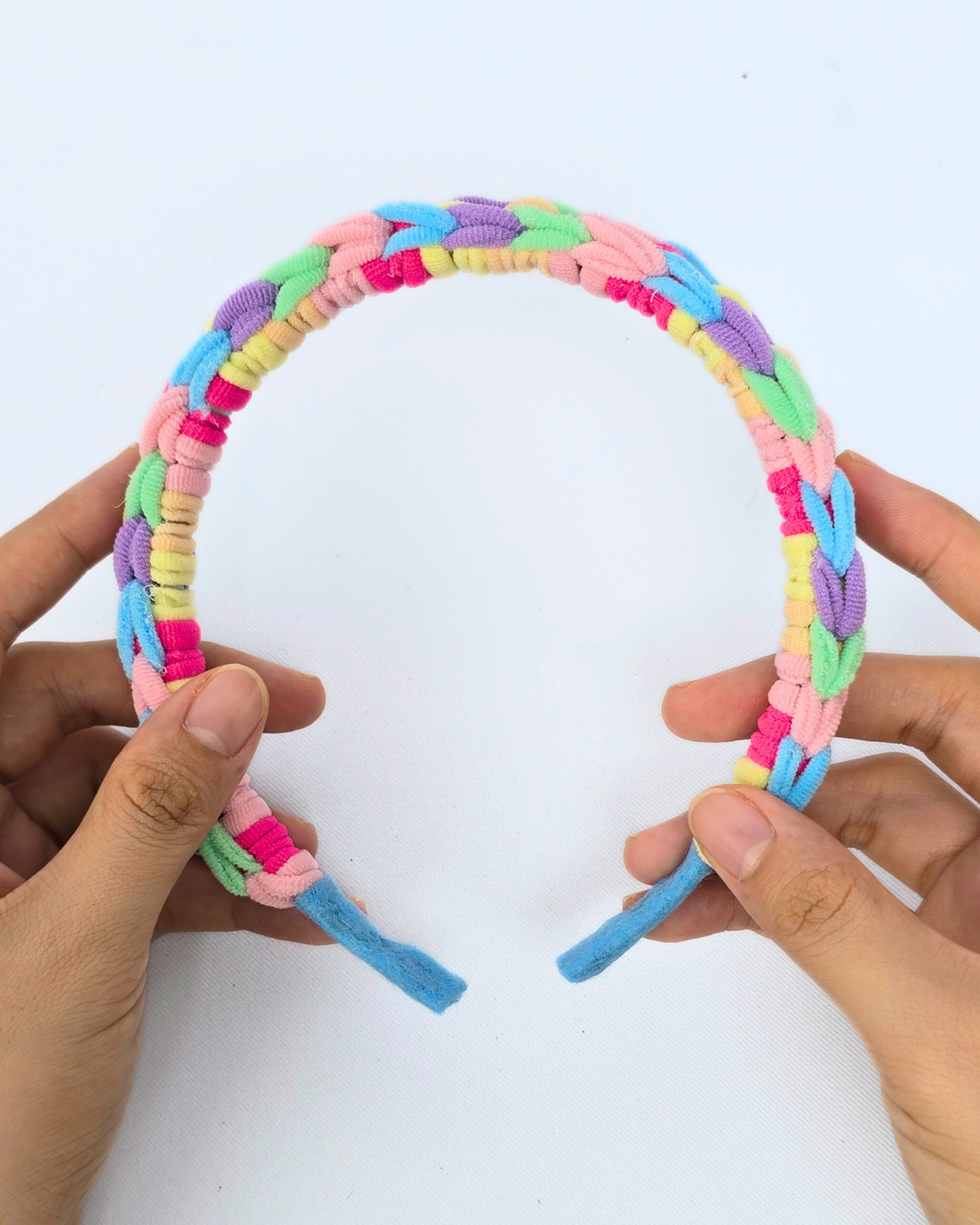 At first, I thought, “How cool could a bunch of hair ties braided together really be?” But as I started weaving, the stretchy texture surprised me. The result? A comfy, chic headband that’s casual, unique, and just so colorful. And guess what? Everyone who saw what I made loved it!