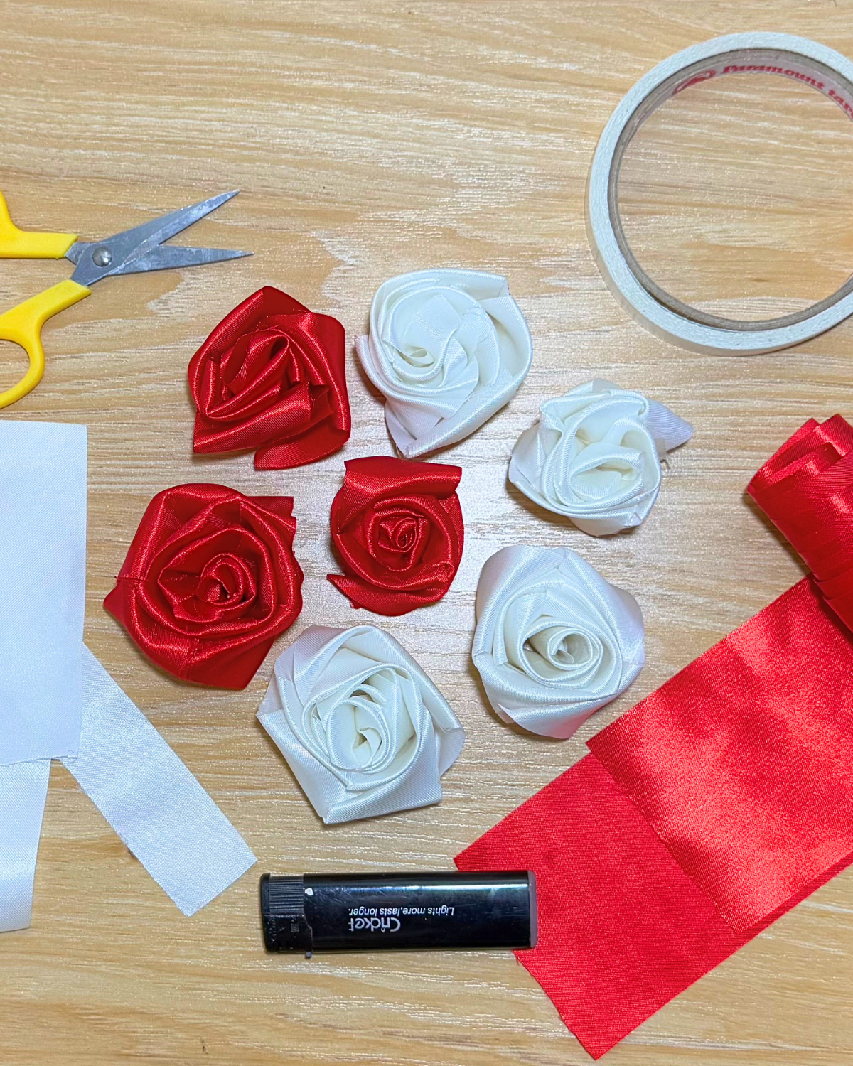 Once you’re done rolling the ribbon, add a small piece of tape to the inner corner of the end and secure it in place.