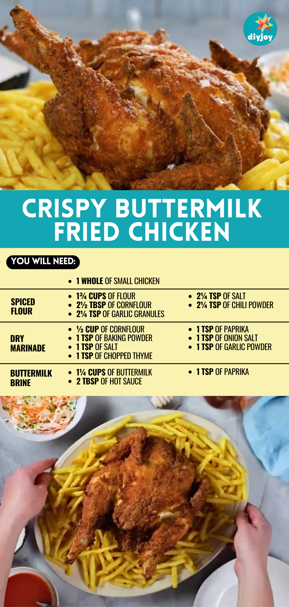 Once you’re ready to cook, place a large pan on a stove over medium-high heat, then add the oil, and let it heat up. Get the chicken out of the fridge, then shake off any extra dry marinade, dip it into the buttermilk brine, and then dredge it in the spiced flour until completely covered. Repeat this process twice, deep fry the chicken for about 17 to 20 minutes making sure to rotate every now and then until brown and crispy. Transfer the cooked chicken to a plate lined with a paper towel, then season with salt, and drizzle it with honey. Serve it along with some fries and coleslaw and enjoy!