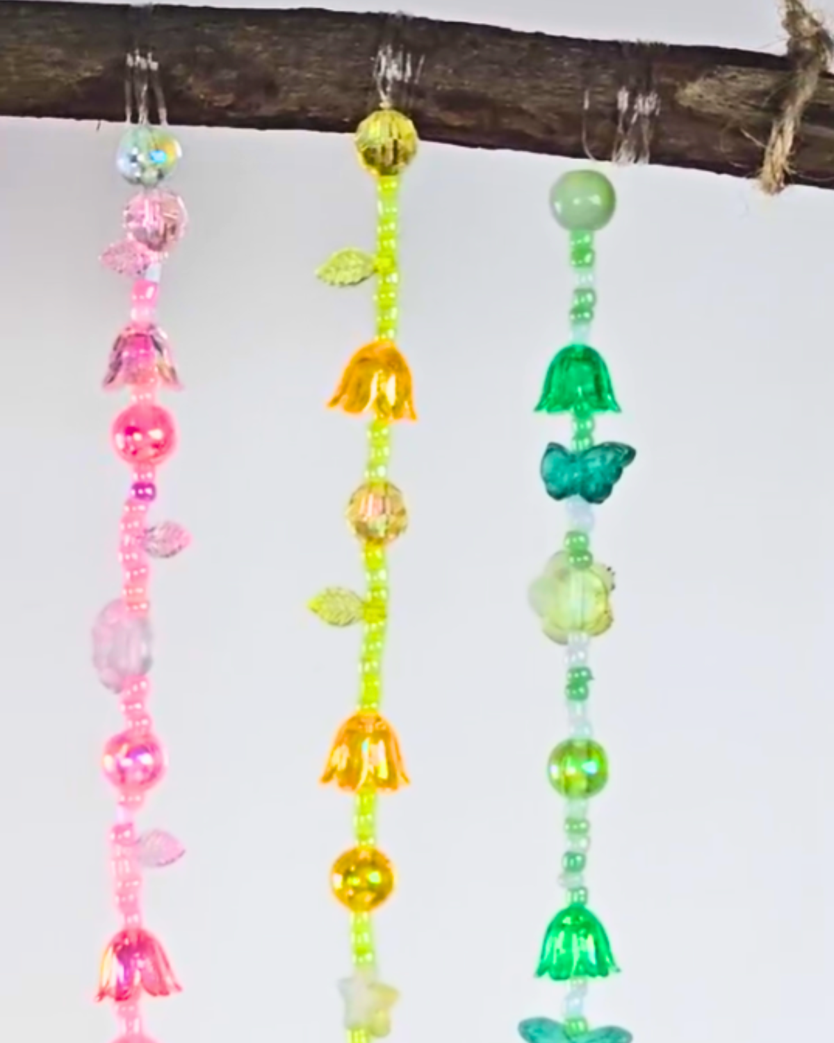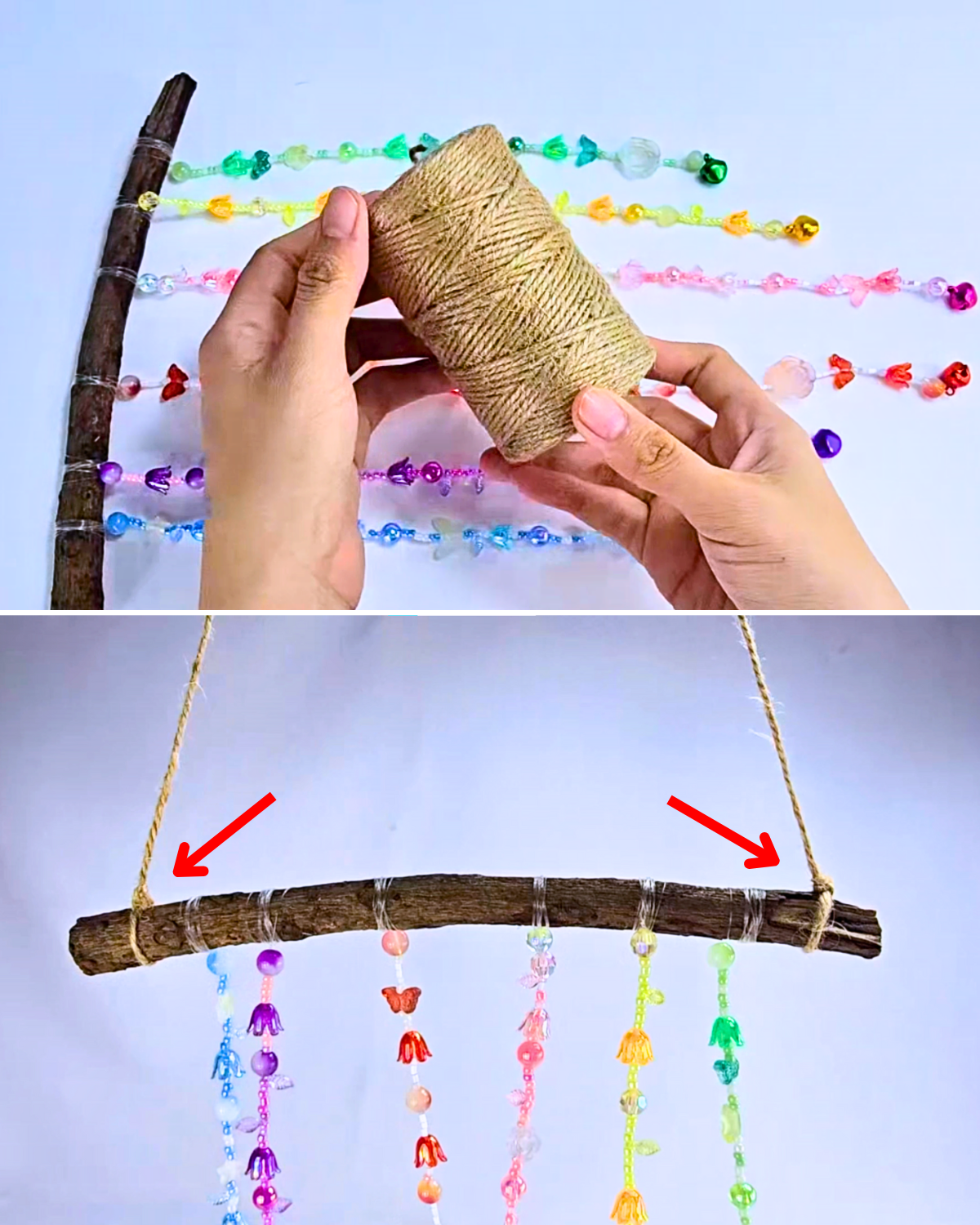 Cut a piece of jute rope and tie each end securely to both sides of the twig or branch. Your beaded wind chime is now ready to hang!