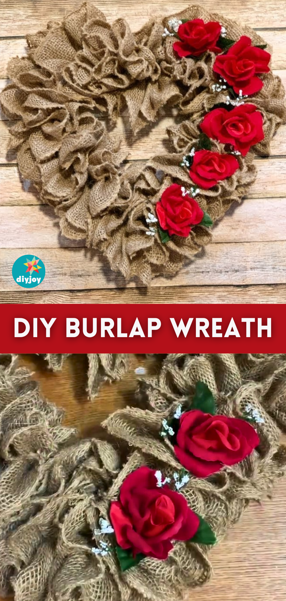 Hold the burlap in place and scrunch them nicely, then continue scrunching the rest of the burlap until you reach the end of the wreath or right where you started earlier, and secure the ends with the floral wire trimming off any frayed ends. Adjust the shape of the burlap so it looks more like a heart, then hot glue some flowers and leaves around, and hang your wreath.