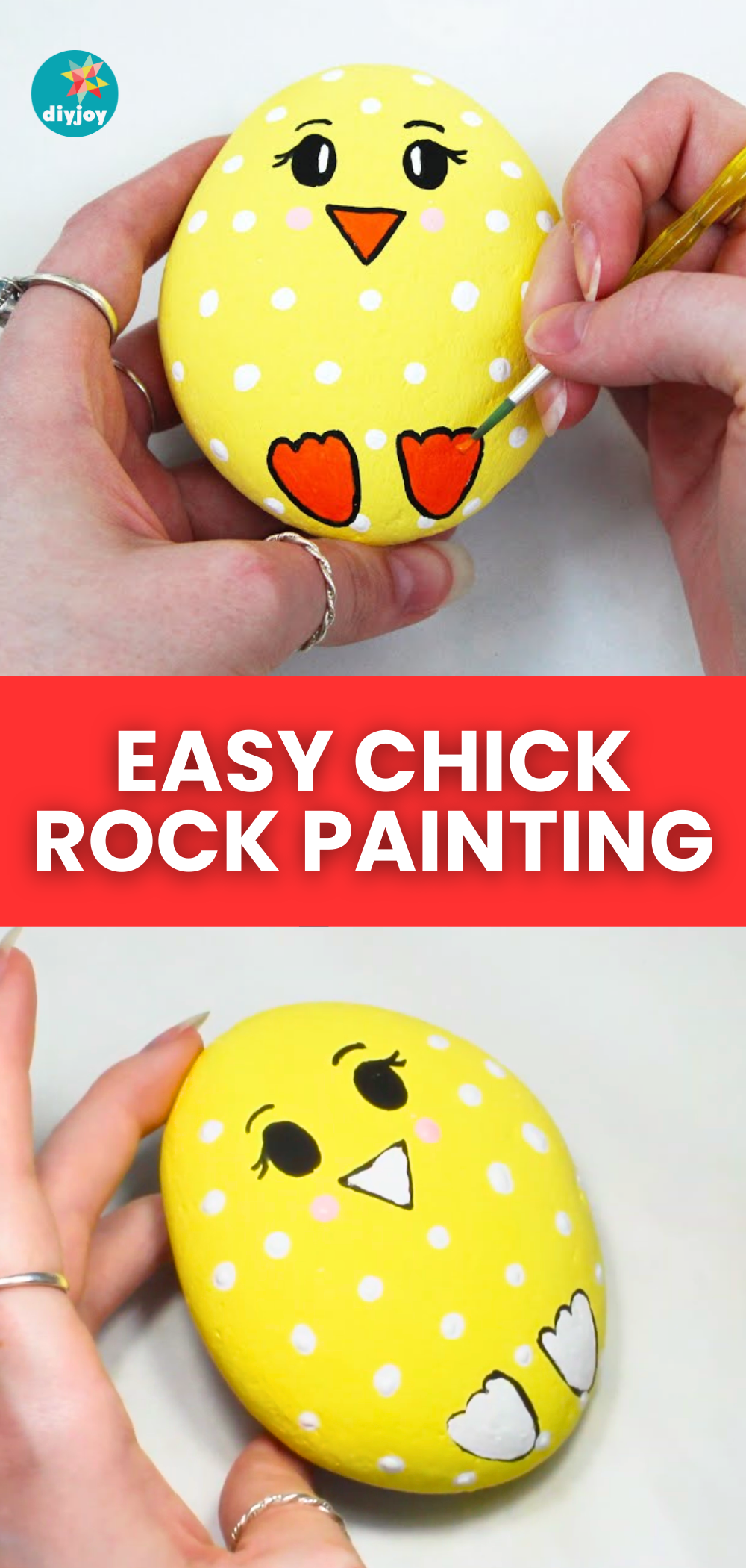 First off, make sure to wash the stone you’re using nicely and clean, then paint it white until completely covered, and allow it to dry. Next, paint the whole stone yellow and let it dry, then using a marking pen, draw the eyes, beak, and feet as shown in the video. Fill in the feet with white paint as well as the beak, then dip the tip of the handle in pink paint, and dab it on each side of the beak.