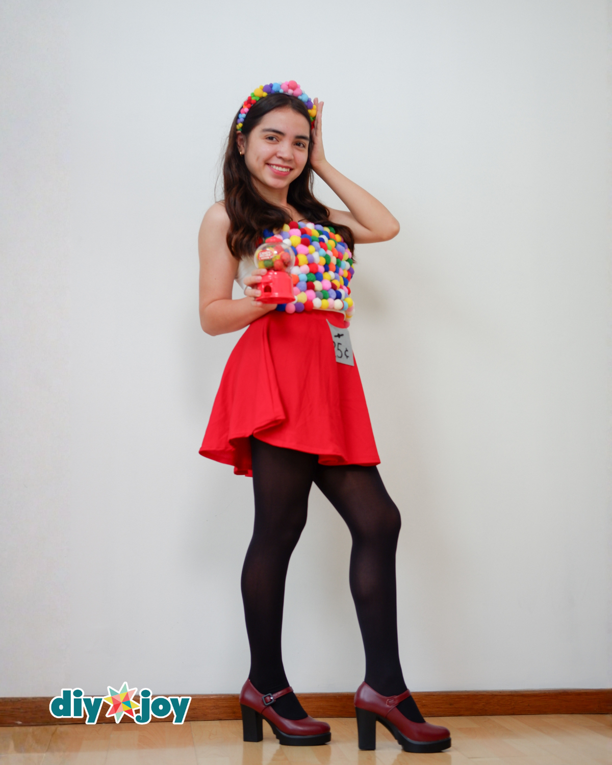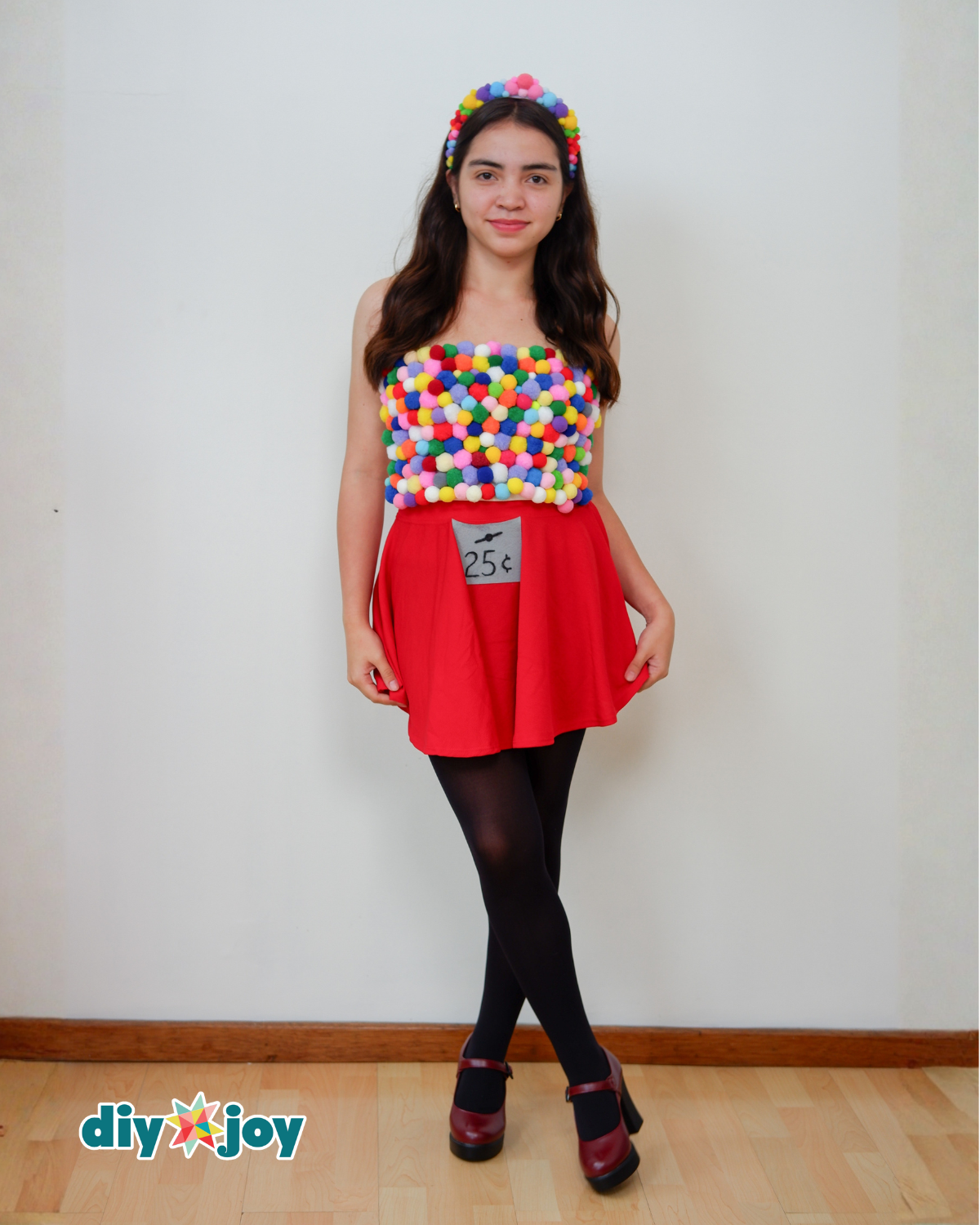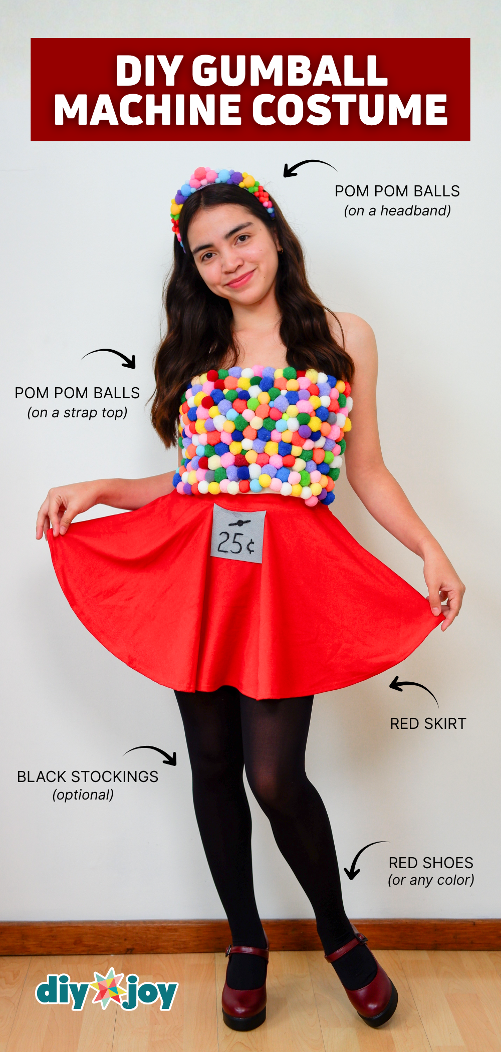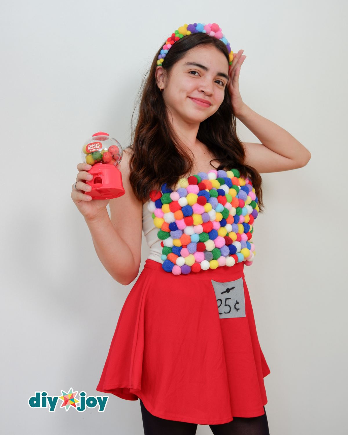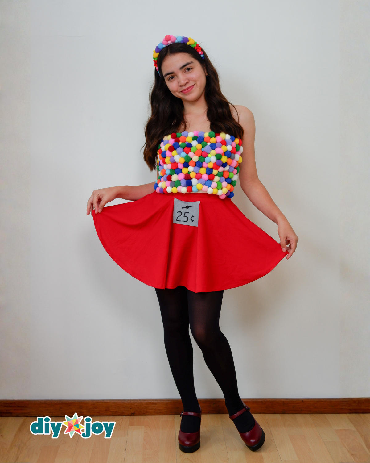 Follow along with the step-by-step tutorial below and learn how to make your own gumball machine costume from scratch, no sewing skills required!