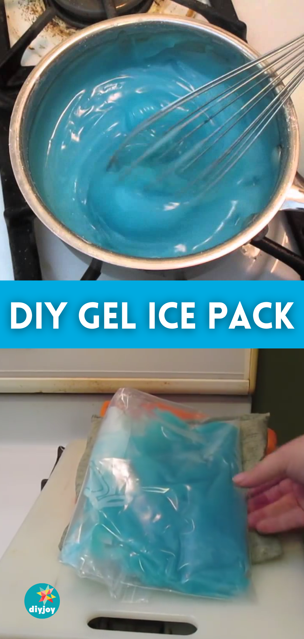 Once the mixture starts thickening, add a few drops of food coloring, or skip this step if you want to cover your ice pack, then continue to whisk them together until it comes to a boil and the consistency has become thick and gloppy. Turn off the heat, then remove the pot, and set it aside to cool completely for about 45 minutes or more.