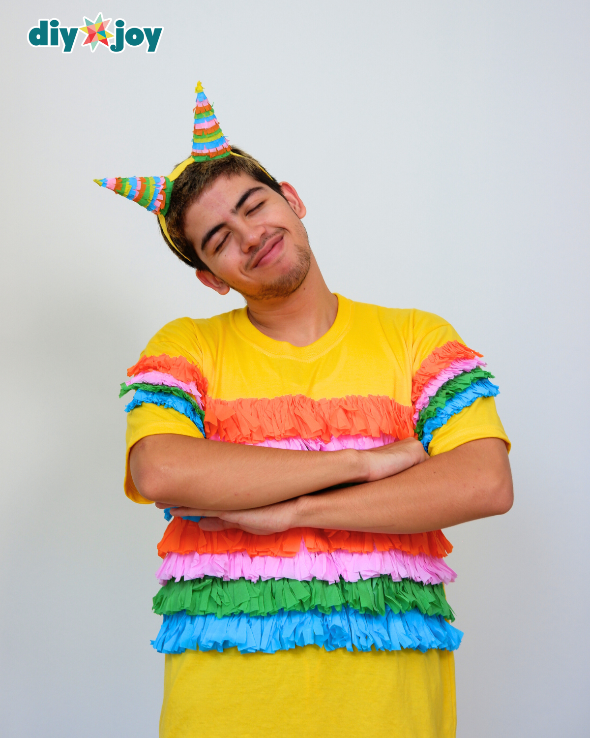 The piñata costume features bright crepe paper fringes that you can easily attach to a masking paper base, making it sturdy enough to dance and party in all night! The best part? You don’t have to ruin your shirt to make it. The paper backing peels off effortlessly when you’re done celebrating, leaving your outfit perfectly intact.