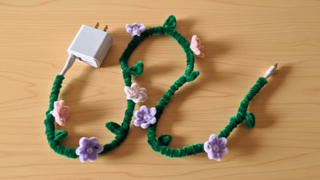 By tightly wrapping green pipe cleaners around your charger, you add an extra protective layer that helps reduce strain and prevent fraying. The vine-inspired design is not just for looks—it adds structure and support, making the cord feel sturdier and more durable. Small leaves and flowers can be twisted directly into the wrap, keeping everything secure while giving your cable a personalized touch.