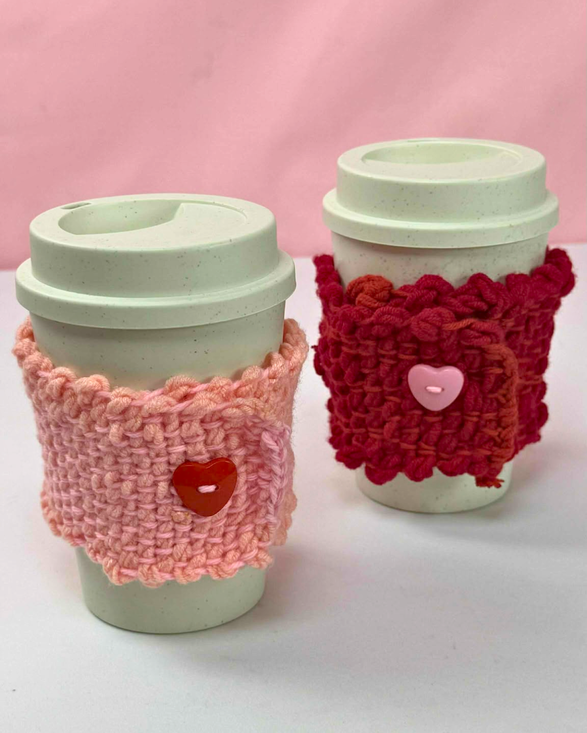 Carefully remove the yarn loops from the cardboard slits. Using a crochet hook, make chain stitches along both ends to secure the weave. Sew a heart-shaped button onto one end of the cozy. Place the woven yarn over the button, then gently pull the button through the weave until it sits on top.