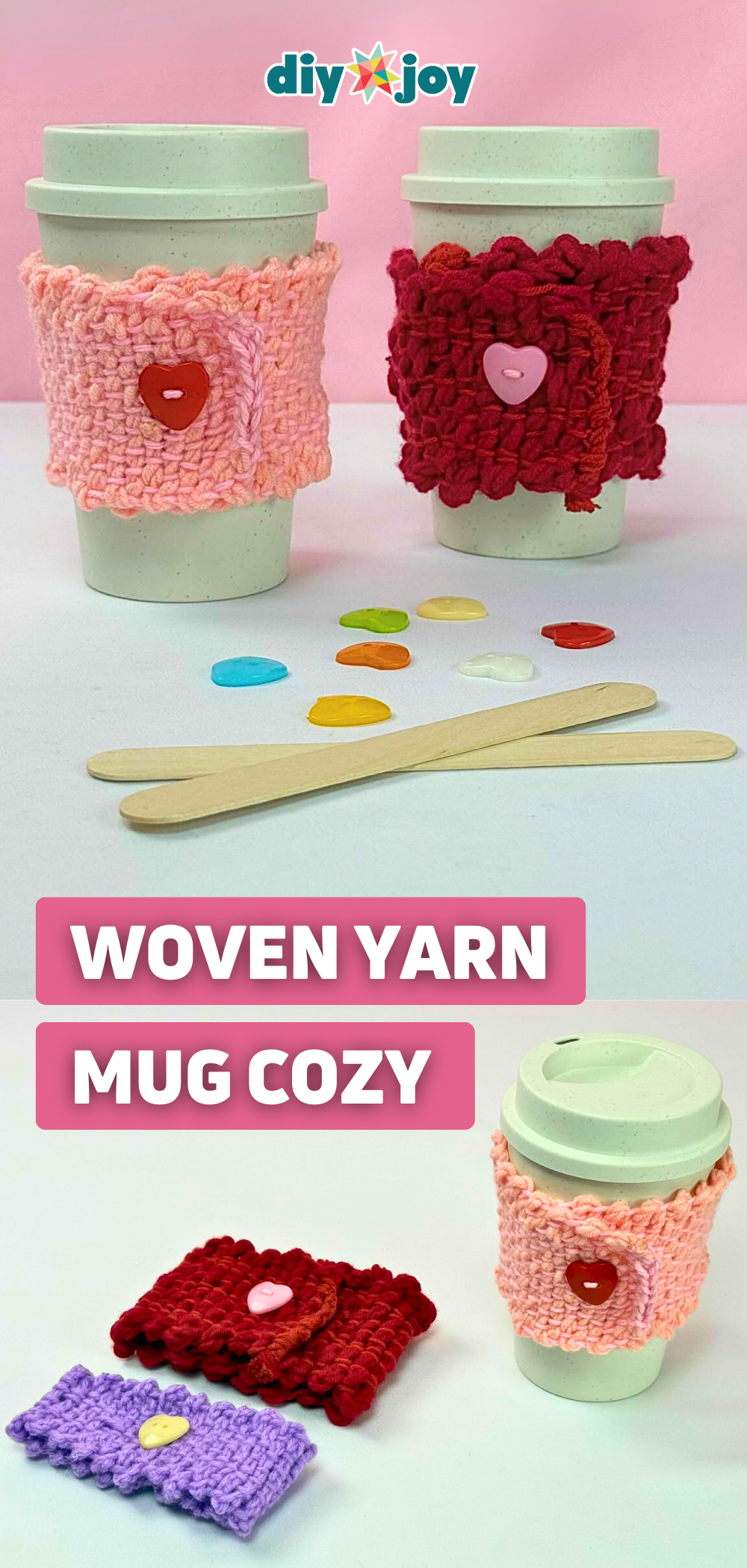 This tutorial will show you how to make a woven yarn mug cozy using just cardboard, yarn, and a popsicle stick. The weaving technique is basic; the only challenge is having the patience to keep going until you reach the end. There’s a touch of crocheting at the finish, but it’s nothing too difficult. Even if it’s your first time, this is a project you can definitely try!