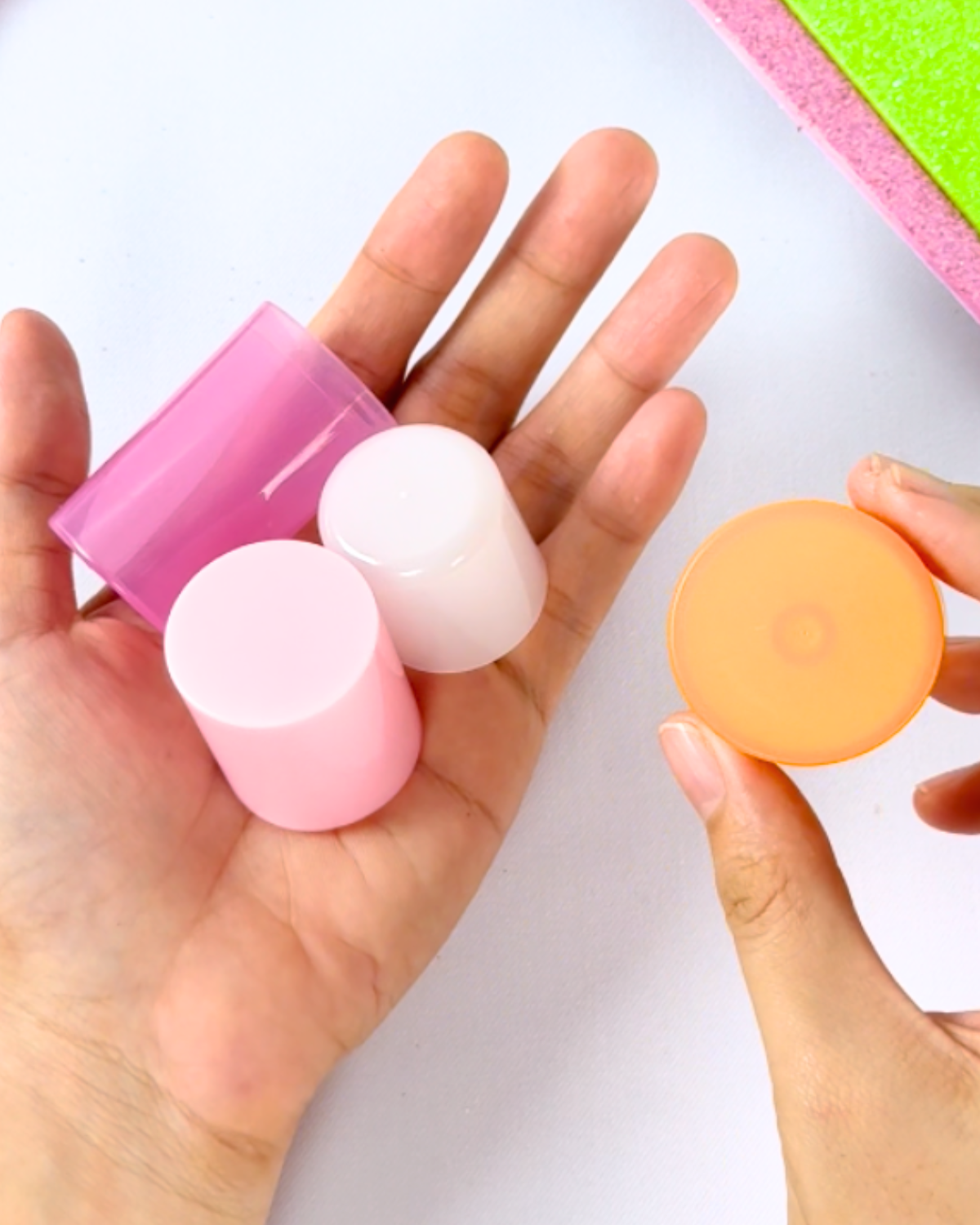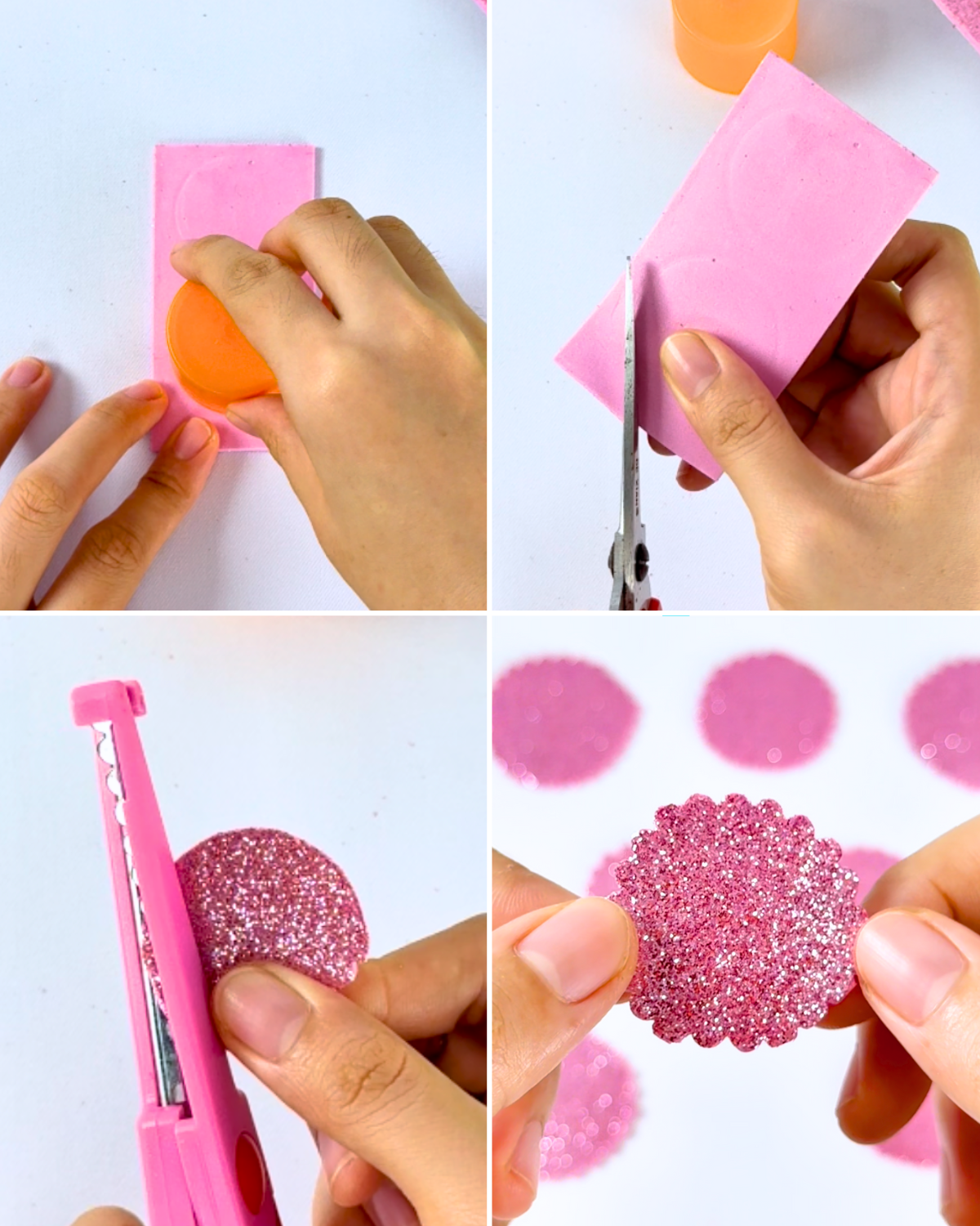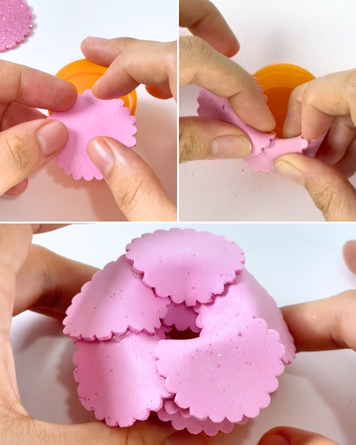 Trace the cap onto the foam sheet, cut out the circle, then use pinking shears to create decorative edges.Step 3: Assembling the petals