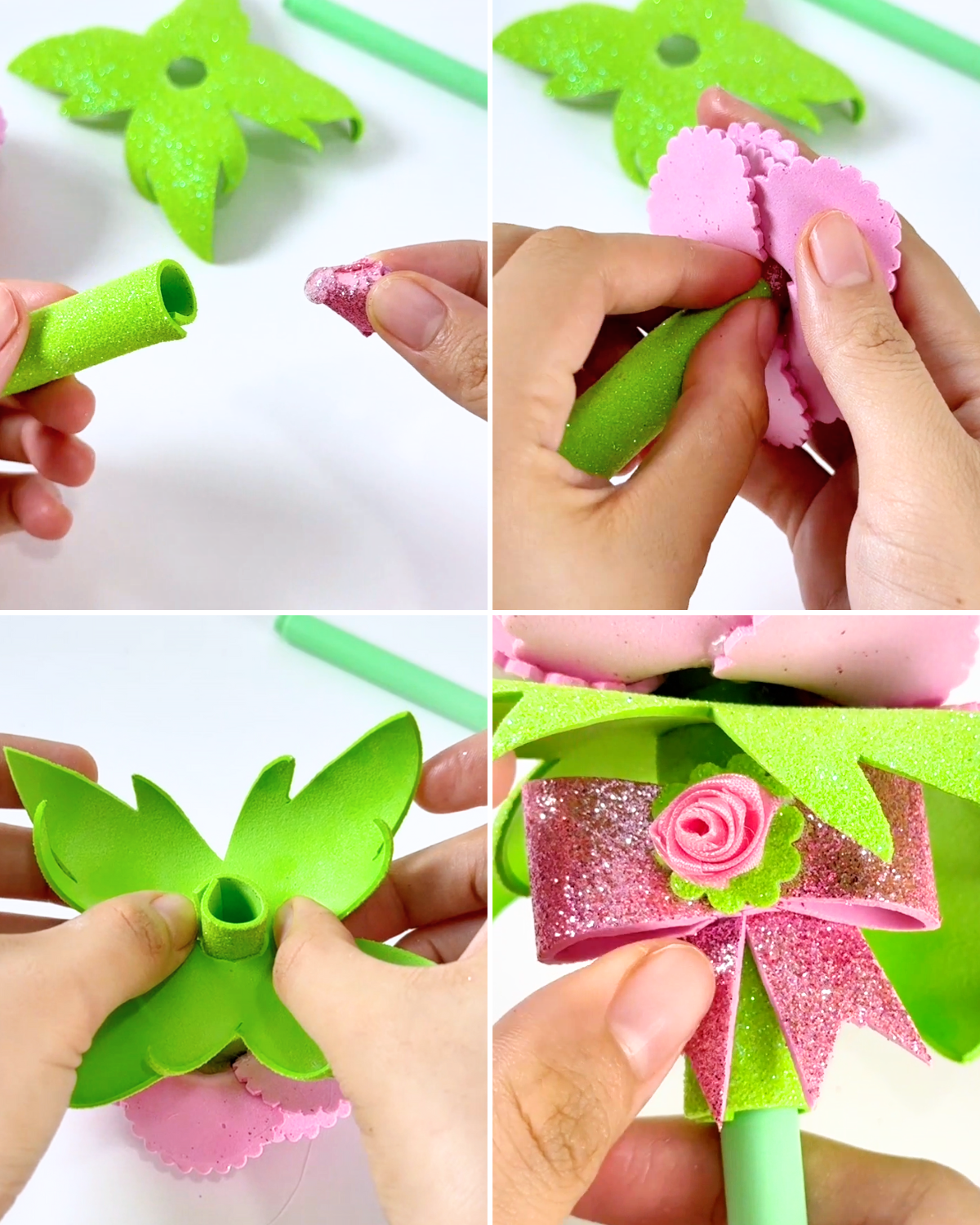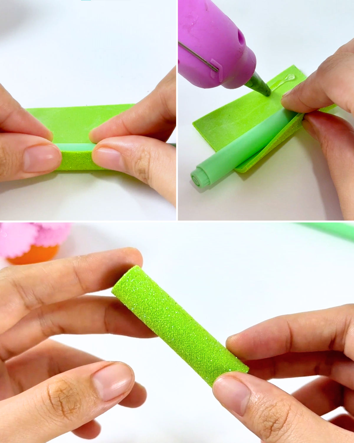 Cut a piece of foam sheet large enough to wrap around the upper half of the pen, then wrap it tightly and secure the edges with glue.Step 5: Assembling the flower