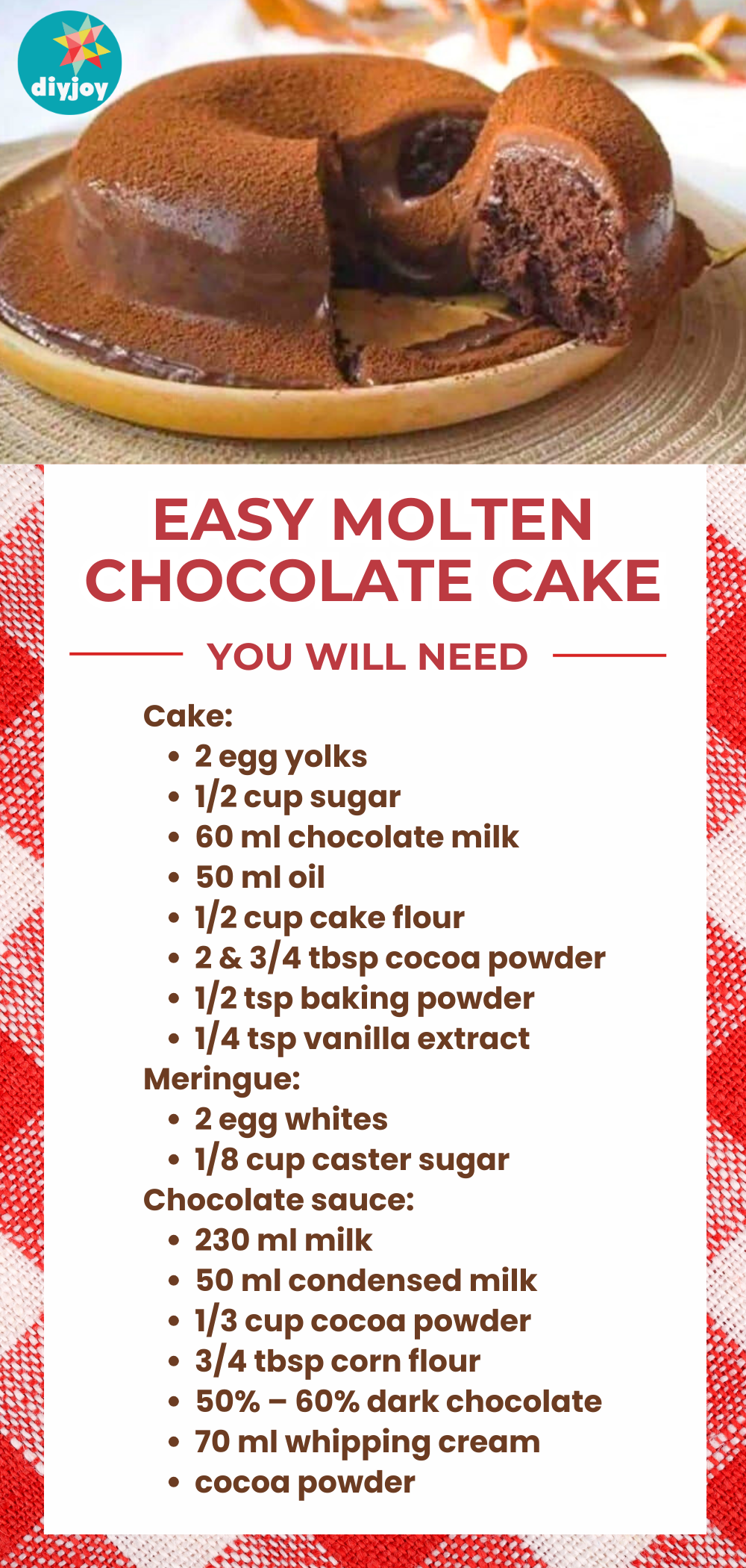 Separate the yolks and whites of two large eggs. In the bowl with the yolks, add 1/2 cup sugar and whisk. Next, add 60 ml of chocolate milk, 50 ml of oil, and 1/4 tsp vanilla extract. Continue whisking until combined, then add 1/2 cup cake flour, 2 & 3/4 tbsp cocoa powder, and 1/2 tsp baking powder. Whisk everything to combine, then set aside. Next, whisk the egg whites with a handed mixer. Add 1/8 tsp cream of tartar and 1/8 cup caster sugar gradually and continue to whisk until soft peaks. After this, gently fold in the meringue with the yolk mixture, then pour it into a greased bundt pan.