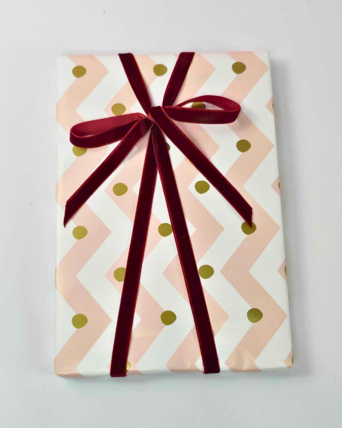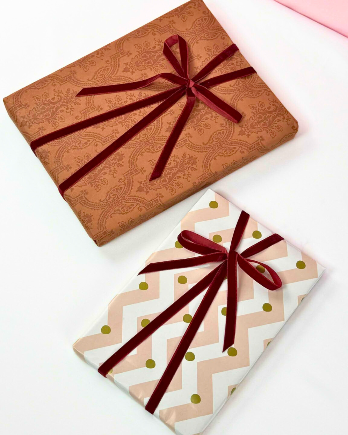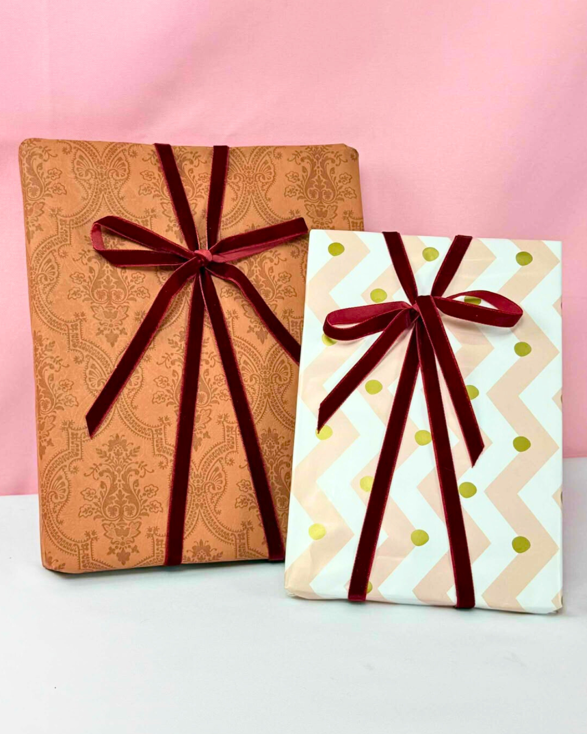 This ribbon hack works with almost any type of ribbon, but my favorite to use is thin velvet ones. They look neat, simple, and elegant all at once. Another great thing about this ribbon-tying technique is its versatility—it’s not limited to square or rectangular gifts. You can use it just as easily on round or oddly shaped presents, and it still looks polished every time.