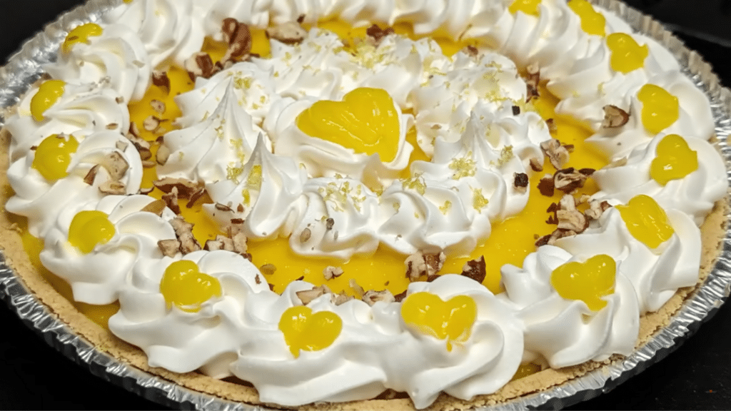 After a few minutes, transfer the lemon Jell-O mixture over the cream layer, then spread it evenly, and pipe the remaining lemon Jell-O mixture and Cool Whip on top decorating it however you want. Sprinkle the reserved toasted chopped pecan and lemon zest on top, then chill or serve immediately, and enjoy!