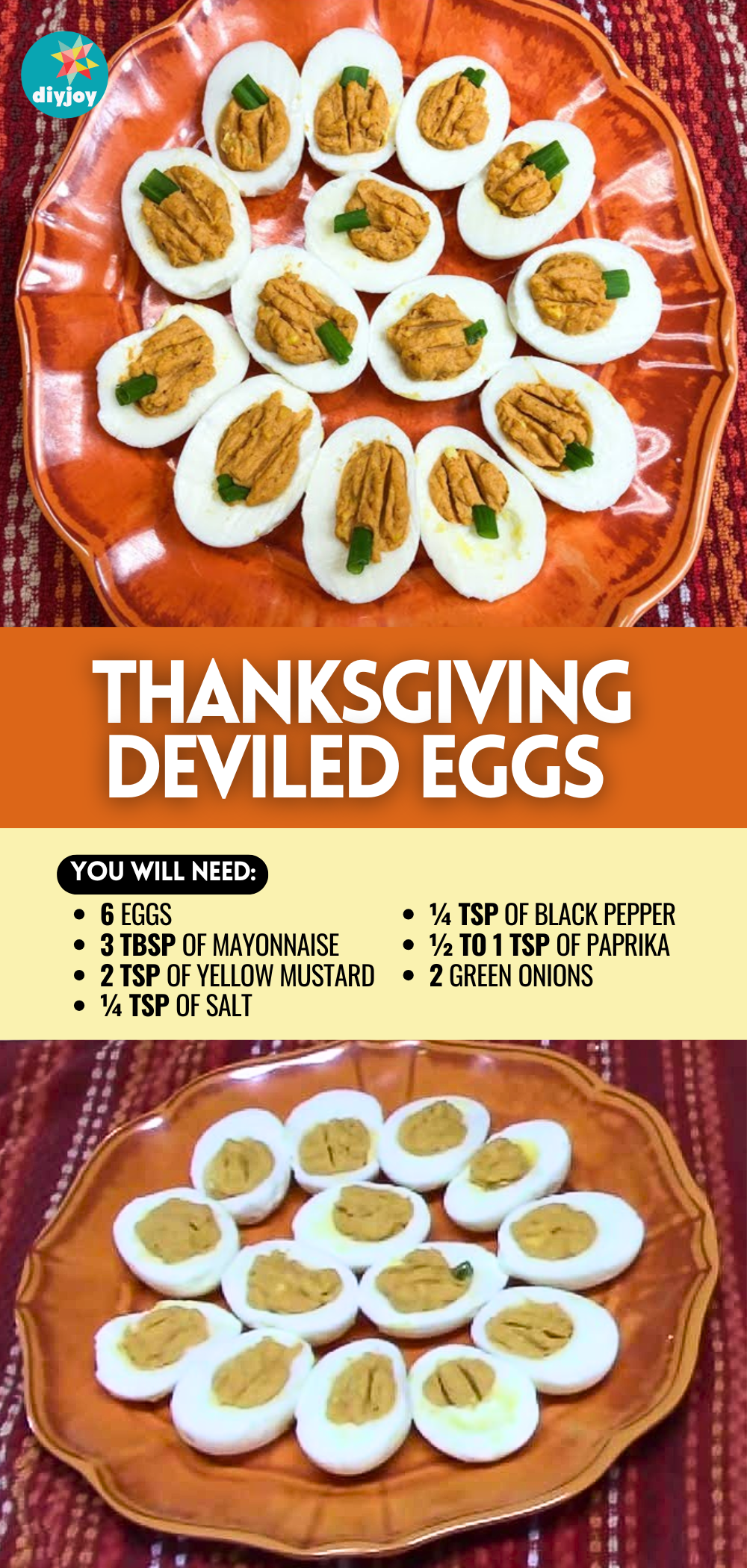 Once boiled, let them sit in the pot with the heat off for about 6 to 7 minutes, then transfer to a bowl filled with ice water for 5 minutes, and start peeling the eggs. Slice the eggs lengthwise, then remove the yolk, place it into a small mixing bowl, and the egg whites on a plate. Grab the bowl of egg yolks, then add the mayonnaise, mustard, salt, pepper, and paprika, and mix them together until well combined. Transfer the yolk mixture to a piping bag, then pipe them into each egg white, and draw two lines down the yolks using a toothpick. Garnish each egg with ¼ inch of green onions to resemble the stem of the pumpkin, then serve, and enjoy!