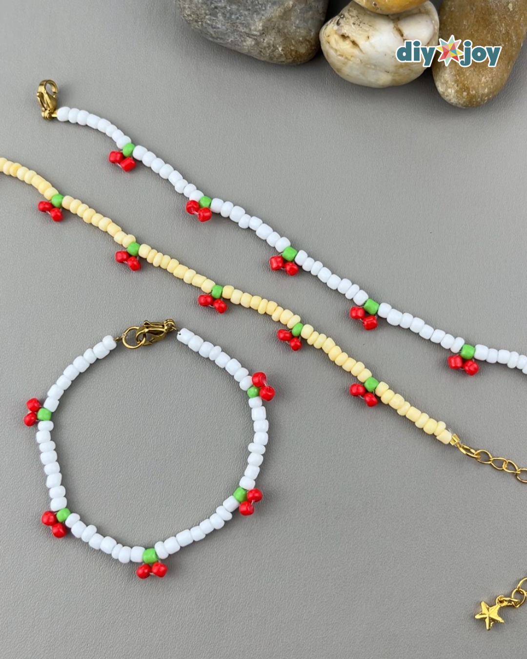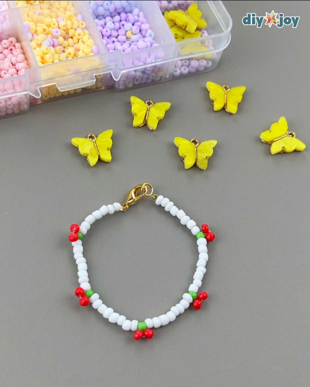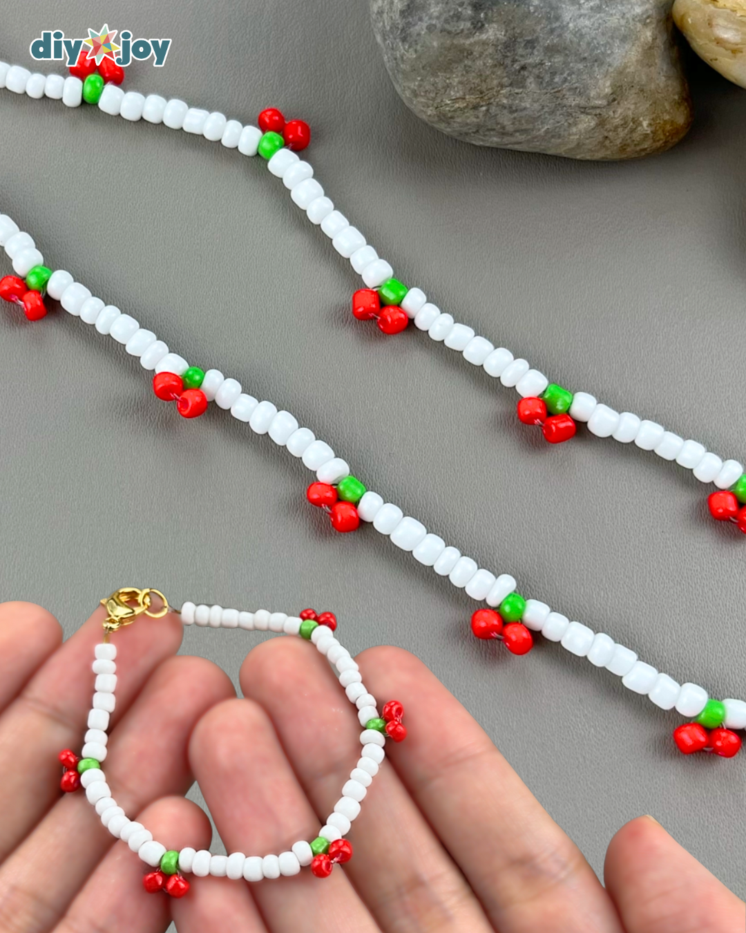 This cherry bracelet is an absolute joy to make! It only takes a few minutes and a hanndful of seed beads. You don’t need any bracelet-making experience at all. The instructions are very easy to follow with no complicated steps. I got so carried away that I made too many bracelets, which shows how much I enjoyed it. It’s a wonderful way to lessen screen time and to be creative with your hands. I’m sure you’ll love it too.