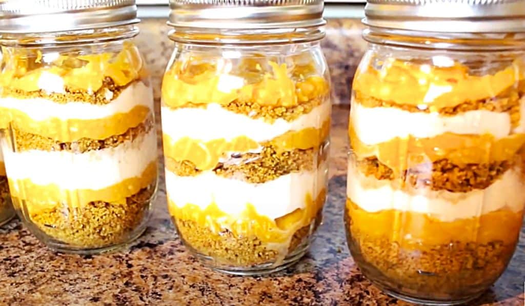 In this pumpkin pie mason jar idea by Kelly Lamich, on YouTube, you will learn to make this wonderful gift idea in a few easy steps. You begin by making your graham cracker crust, pumpkin filling, and whipping cream. You will start layering your ingredients beginning with the graham cracker layer.
