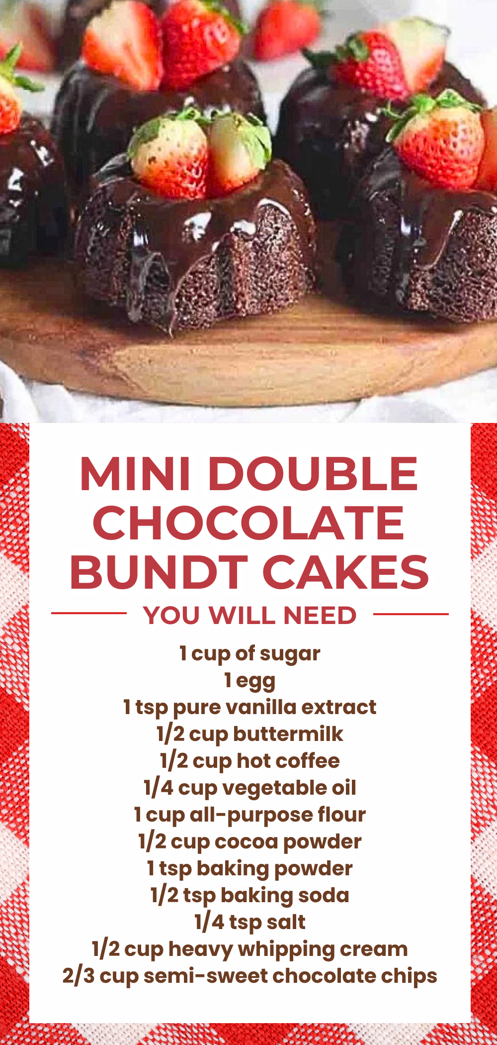 Bake it at 350 degrees F for 20 to 25 minutes. Once done baking, remove it from the oven and let it cool down for ten minutes. In the meantime, make the chocolate ganache. Transfer the chocolate chips to a bowl, then gently pour the 1/2 cup hot heavy whipping cream. Leave it for three minutes, then mix until smooth. Now, pour it over each mini bundt cake. Serve with some fresh strawberries and more grated chocolate. Enjoy!
