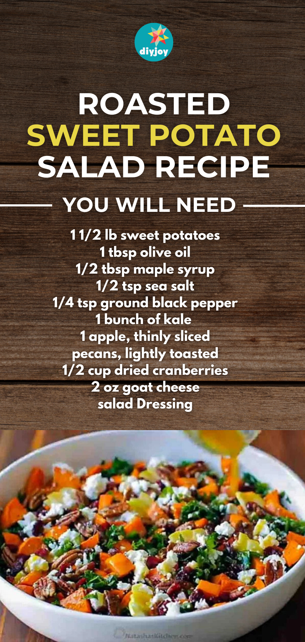Next, add the roasted sweet potatoes followed by the sliced apple, roasted pecans, dried cranberries, and 1/2 cup of crumbled goat cheese. Drizzle the rest of the dressing over, then serve.