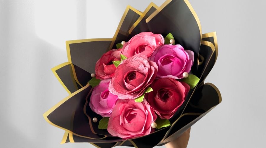 The right wrapping paper design will make your paper flowers stand out even more! The gold edges of this black wrapping paper match perfectly with these DIY roses.